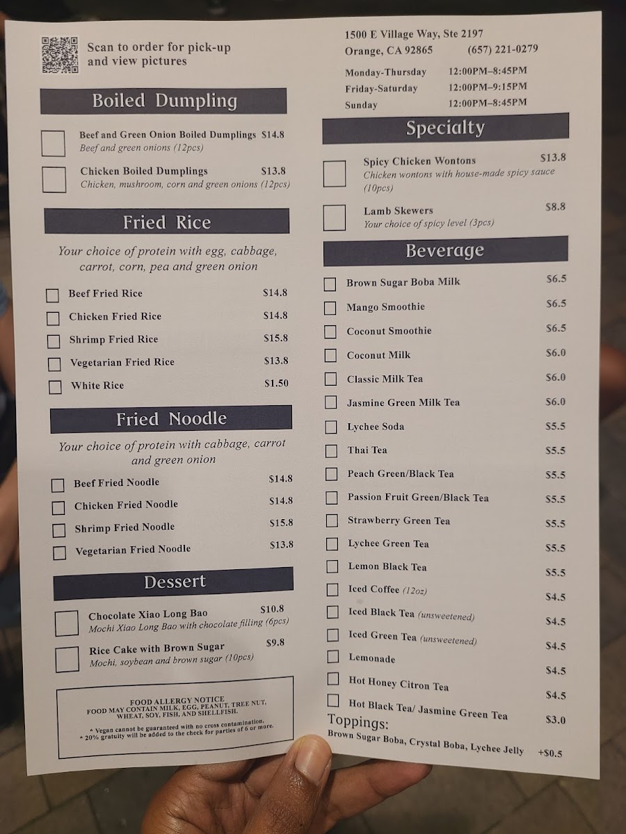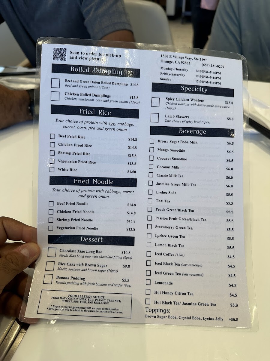 Whether you're stopping by for a quick bite or a relaxed meal with friends or family, you'll find highlights like tender chicken dumplings, savory crab and beef xiao long bao, and crispy pan-fried dumplings that are just right for sharing. Alongside these, dishes like orange chicken and shrimp fried noodles offer familiar favorites, while vegetable pan-fried dumplings and sautéed string beans provide lighter options.